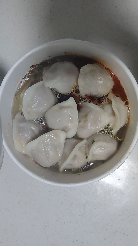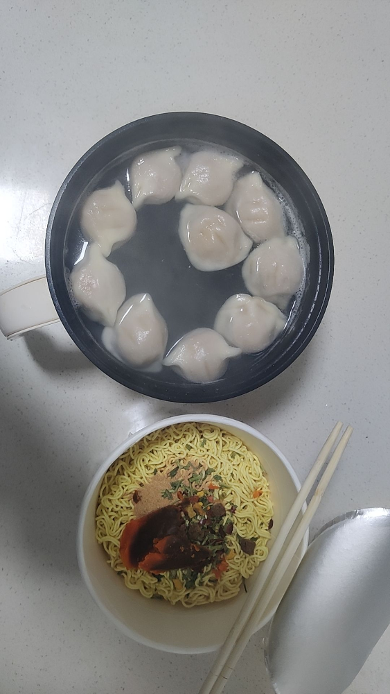 自创吃法,泡面饺子,小煮锅里烧水煮饺子,然后直接倒入泡面碗。