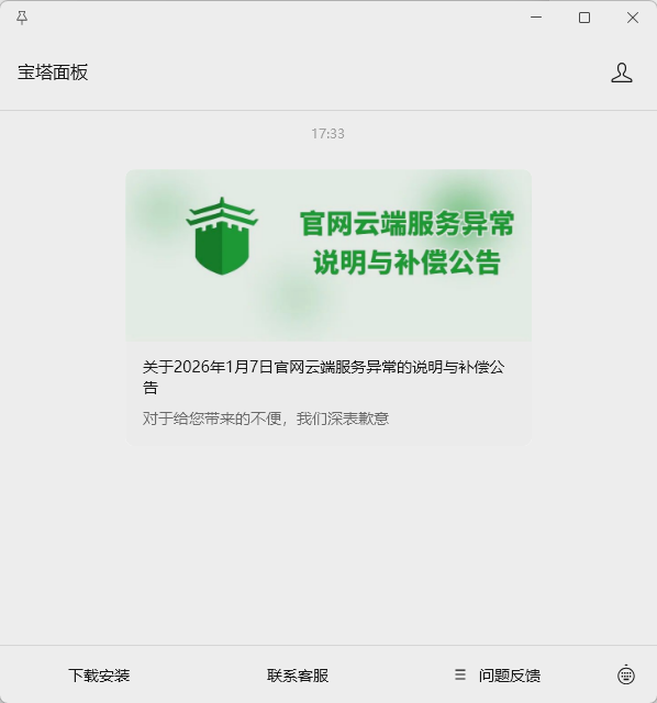 下午5点,无意中在微信看到了宝塔面板公众号推送的推文,标题为:关于2026年1月7日官网云端服务异常的说明与补偿公告。