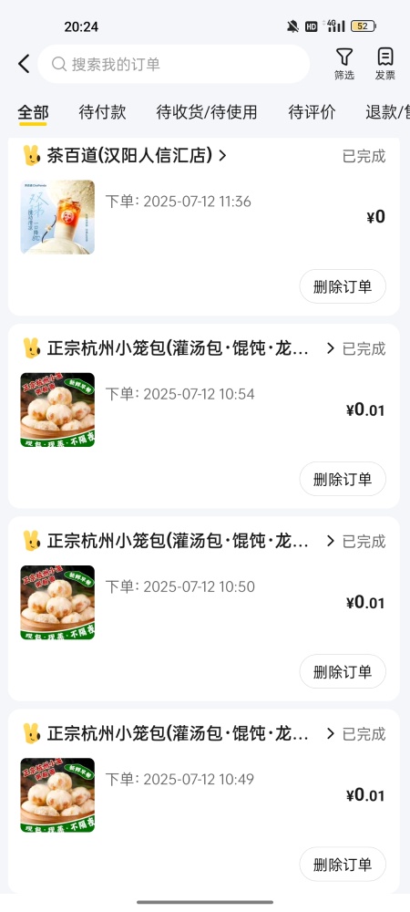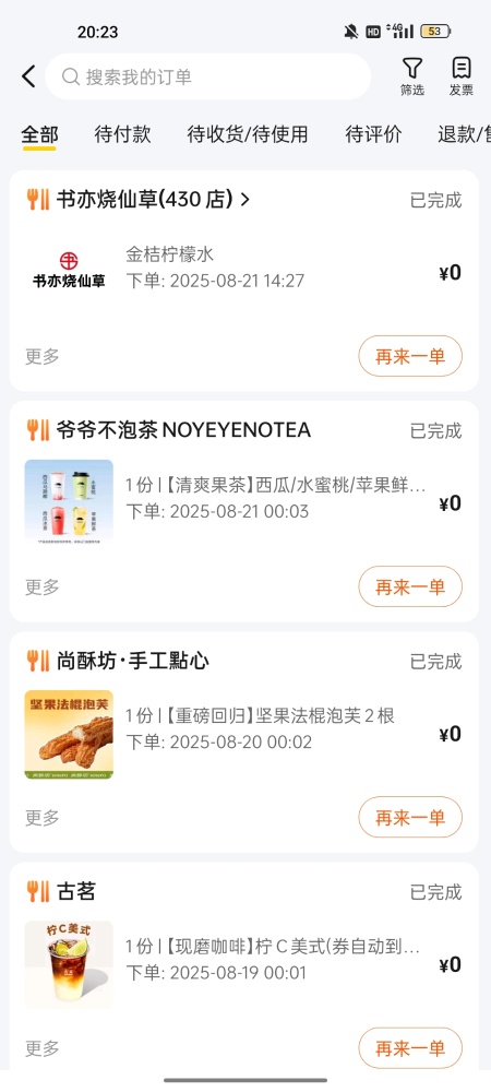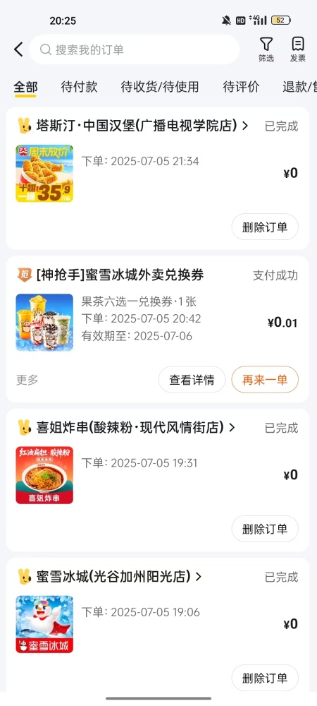 1.9 元的蜜雪冰城能送货上门,1.9 元就能拿下塔斯汀两件套(汉堡 + 可乐)还包配送,6.9 元的老乡鸡,还有白送的瑞幸、星巴克,蜜雪冰城、爷爷不泡茶、茶百道这些奶茶,以及麦当劳、肯德基这类常见的快餐品牌,那会儿真是随便点。